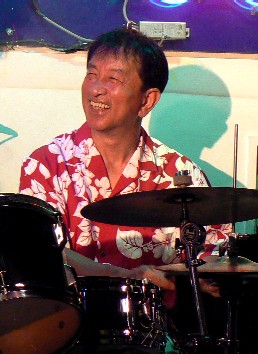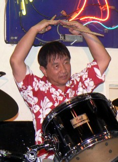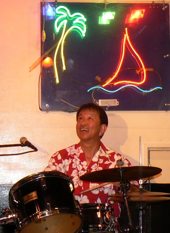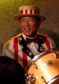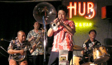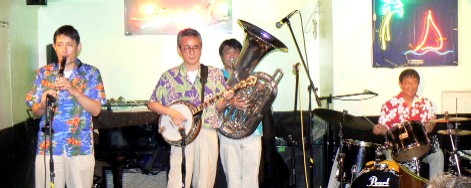 この日は薗田憲一さんの告別式でした。メンバー(特に浩ちゃんかな?)に景気をつけてあげようと、集まってくださったお客様で、お店はいつもより賑わっていたように感じました。浩ちゃんを始めメンバーも、きっと嬉しかったと思います。メンバーも、客席も、それぞれにいろんな思いを胸に抱きながらの、デキシーランドジャズのひと時。浩ちゃんはMCの中で「皆さんから元気をもらって、そして僕達からも元気をお送りします」と言っていました。もちろん言葉どおりに、ハッピーな演奏を聞かせてくれましたよ。 1stステージは、♪インディアナのお家へ帰ろうから始まり始まり、Dixie Bombersの専属歌手、S崎さんの歌は、アロハの季節ということでハワイアンの♪珊瑚礁の彼方に。3ステージ全てハワイアンを歌ってくださったS崎さんもアロハシャツを持参されて、とても素敵でした。 アロハといえば、メンバーそれぞれがもっているアロハシャツの話になりました。浩ちゃんが持ってるのは全部お客様からプレゼントされた物だとか、永生さんが今日着てるのは先日青森で(笑)買った物なのだとか・・・そしてこの日に井桁くんが着てたきれいな水色のアロハシャツは、浩ちゃんが井桁くんにあげたんだって。落ち(笑)は、「これしか持ってないんです。」でした(爆)。いえいえそんなことはありませんよね(^^;去年のの夏のライブレポートを見たら、ちゃんと(?)違うアロハも着ていらっしゃいました(≧▽≦) 2ndステージでは、ここ、Stage-1のT柳社長のお誕生日をみんなでお祝い。T柳さんおめでとうございました〜(^^)これからもよろしくお願いしますm(__)m