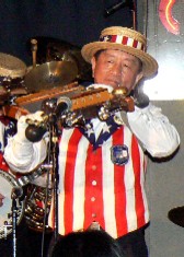 やっと梅雨明け!夏本番記念(?)のMinorityライブは大いに盛り上がりました。メンバーは夏らしくアロハシャツ(^^)。Jackさんは、夏の喜びをどう表そうかと悩んだ挙句(?)ということで、ソックスを紅白のボーダーにしてみたとか(笑)。 各ステージで、Jackさん独特の歌を楽しみつつ、いつも無口な井桁くんが、色々後ろでしゃべるのを、Jackさんが微妙にあしらったり・・・(爆)、いつも通り無口な小森くんは、その風情で笑いを取ってみたり・・・(^^;。Minorityならではの雰囲気は、ホントに楽しかったです。浩ちゃんも大好きだそうで、3人の様子を見ているとき浩ちゃんは、本当に楽しそうな笑顔でした。 Jackさん一流の曲紹介による演奏は、もちろんご機嫌!(^^)。2ndステージはJackさん曰く「中華三部作」で始まりました(笑)。チャーハンにギョーザにラーメン(^^;さてどれが何の曲だったか・・・わかるかな〜(笑)。 3rdステージでは、お客様のリクエストから「浦安三部作」と題してディズニーの曲をやったかと思えば、浅草の定番のあの曲、ラストは満を持して浩ちゃんのロングソロ!♪セントルイスブルース!やっぱりカッコいい〜〜〜! この日は、お友達のよーこちゃんとご一緒のライブ鑑賞。浩ちゃんのロングソロを初めて見たというよーこちゃん、とっても喜んでくれました。