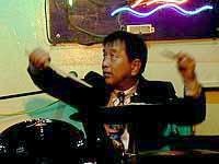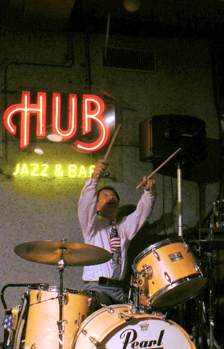 浩ちゃんのバスタム連打がカッコイイキャラバンから始まったこの日のライブ、1stステージでのメンバー紹介は、なんと!もてる順!「え〜!どんな順番?!」と期待したのですが(^^;浩ちゃん一渡りメンバーと顔を見合わせて「・・・いや、もめるから止めとこう(笑)」だって(^^;なぁんだ(爆)。 演奏は、いつもどおりメンバーそれぞれのフィーチャーを織り交ぜつつ、客席からのリクエストも結構活発に出て、FJMでは珍しい曲などもありました。もちろん浩ちゃんのドラムソロも満載!2ndステージラストは、お待ちかねのロングソロ、Dark Eyes!ちょっといつもと違う顔ぶれだったお客様も大満足(^^)で、あちらこちらから、賛辞の掛け声がかかって、大盛り上がり。メンバーもいつもよりさらに演奏に力が入っていたような気がしました(^^)。 ********** そしてこの日は、月初のスヰング五重奏団ライブの時に来て、すっかり浩ちゃんのドラムのファンになったと、アメリカから来ているという“ヒノ・ムネノリさん”が、帰国を延ばしてまで遊びに来てくれて、素敵なピアノを聞かせてくれました。 |